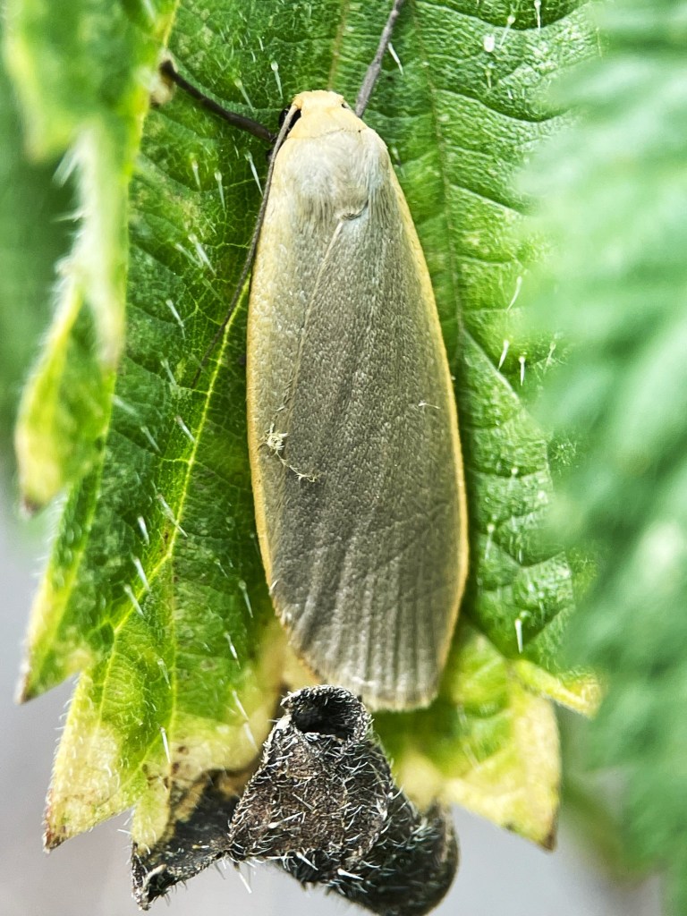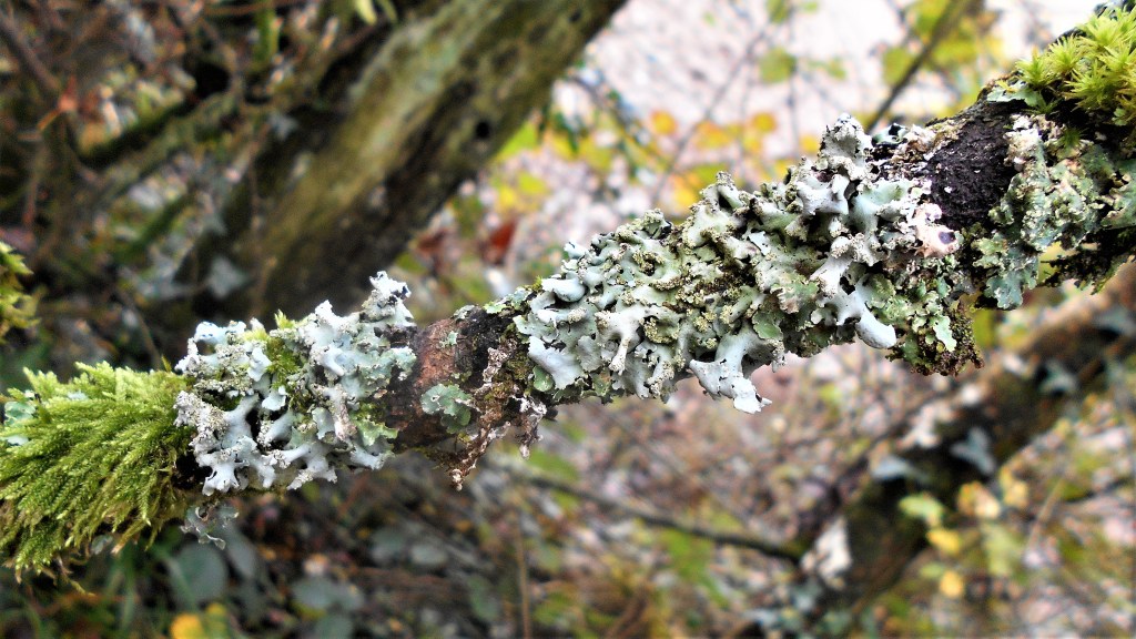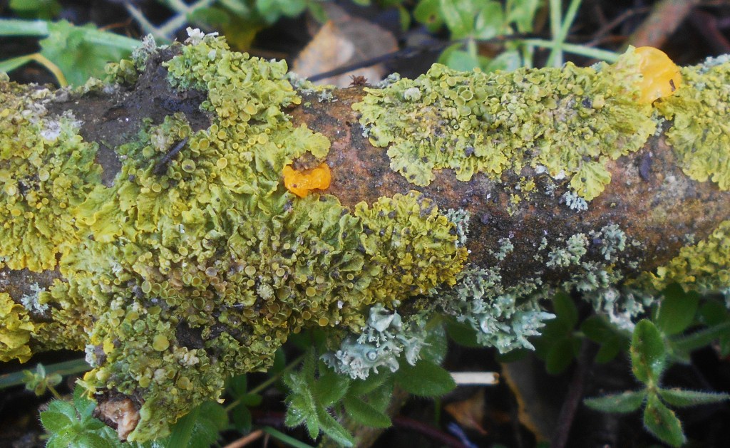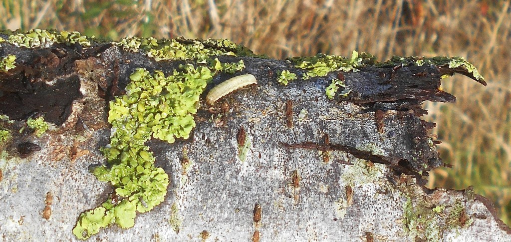 As we passed the line of wych elms bordering the fields we spotted the side of one of the tree split down to the trunk, the broken half lying across the verge and close by a sheath of one of its branches beside it. The cluster of bright, lime green lichen which clung to the bark glowed in the sunlight but when we picked it up, we noticed the small grub or possible bark beetle larva on the outside.