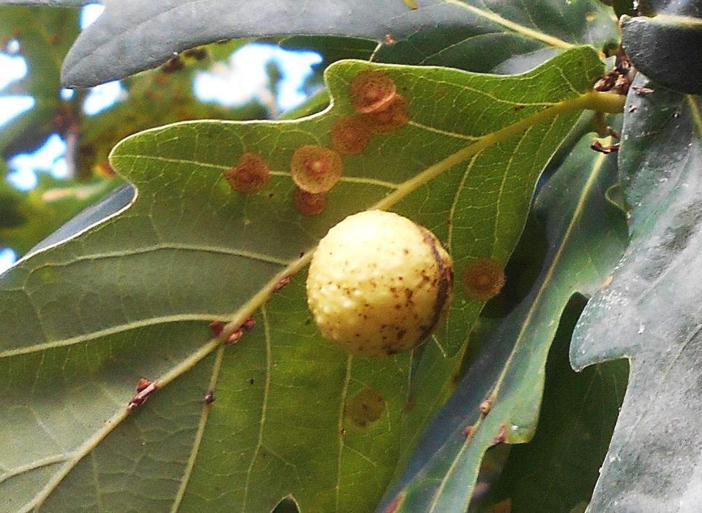 Knopper Galls (which are are greenish-yellow and sticky at first but ‘ripen’ to a woody brown in early autumn, in this case very early(!) at which point they drop to the ground. “The larvae pupate inside and spend the winter tucked up in their galls before emerging as adults the following spring. Interestingly, every single one of these emerging adults will be female which seek out a Turkey Oak to initiate phase two, by laying their eggs on its catkins. These develop inside a second type of gall, from which both male and female wasps will emerge. They form the second, summer generation and will go on to lay eggs on native Oak trees, creating more weird and wonderful Knopper Gall sculptures.” copyright: Emma Chaplin Sussex Wildlife Trust