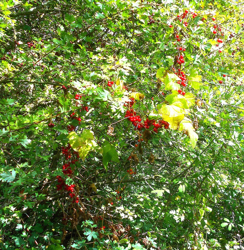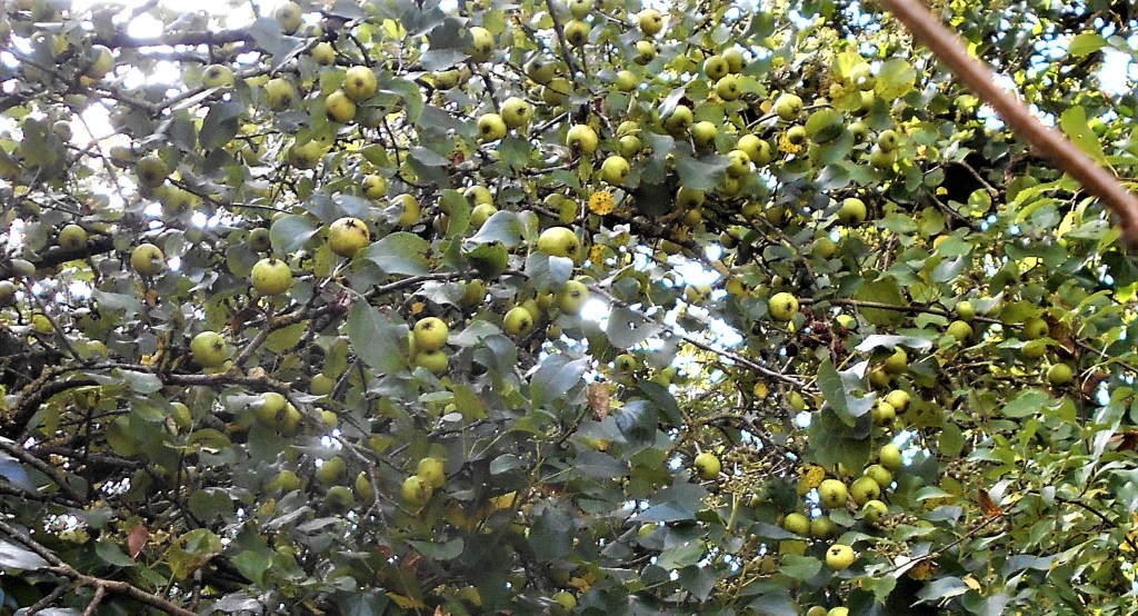 The warmest summer on record brought a premature autumn this year – so the floor beneath the golden crab apple tree was already littered with fallen fruit. Hawthorn trees, which usually produce their crimson berries from mid-September onwards, have been festooned since the second week of August but still hangng on; while blackthorns are still drooping under the weight of huge, ripe, purple sloes so the expressed fear that there wouldn’t be enough to feed the overwintering birds appears to be unfounded.