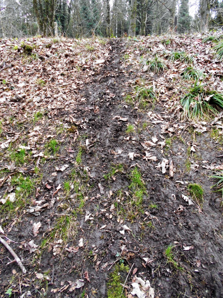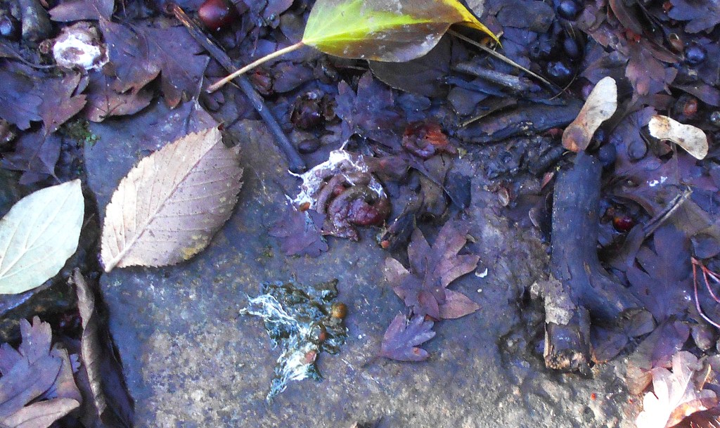 Fruit stones, probably from Hawthorn berries, among the bird droppings under the trees – signs of the Blackbirds, Song Thrushes, Mistle Thrushes and other fruit eating birds which we see flying around the hedgerows and trees, or maybe even the newly arrived migrants, Fieldfares and Redwings. The well worn tracks coming down through the undergrowth, across the cycle path to disappear through the hedge into the wide, open pastures of the sheep field – possibly badger, roe deer or most likely foxes like the one which shot across the path in front of us as we slowly climbed the hill.