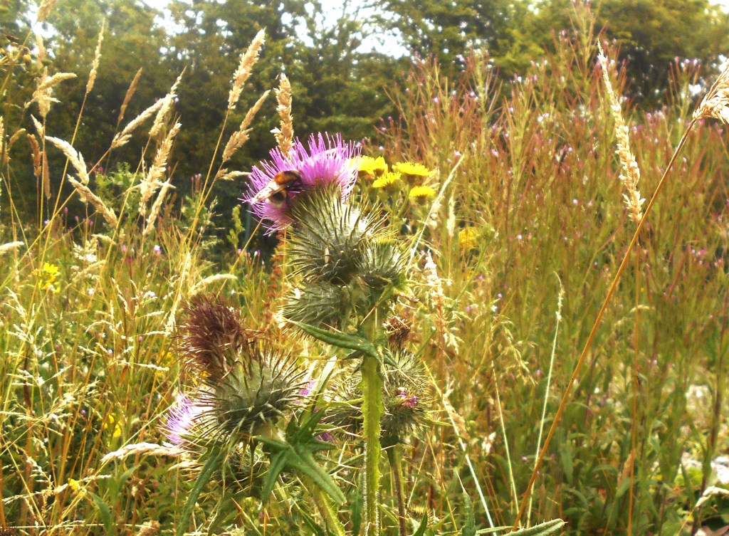 The top of the hill is chalk downland where the Woolly Thistles are most abundant – a magnet for bees, they are just beginning to open and make such a striking sight.