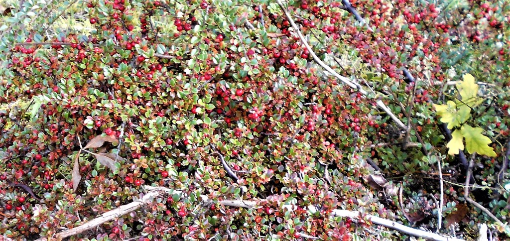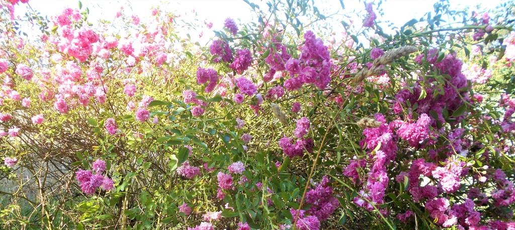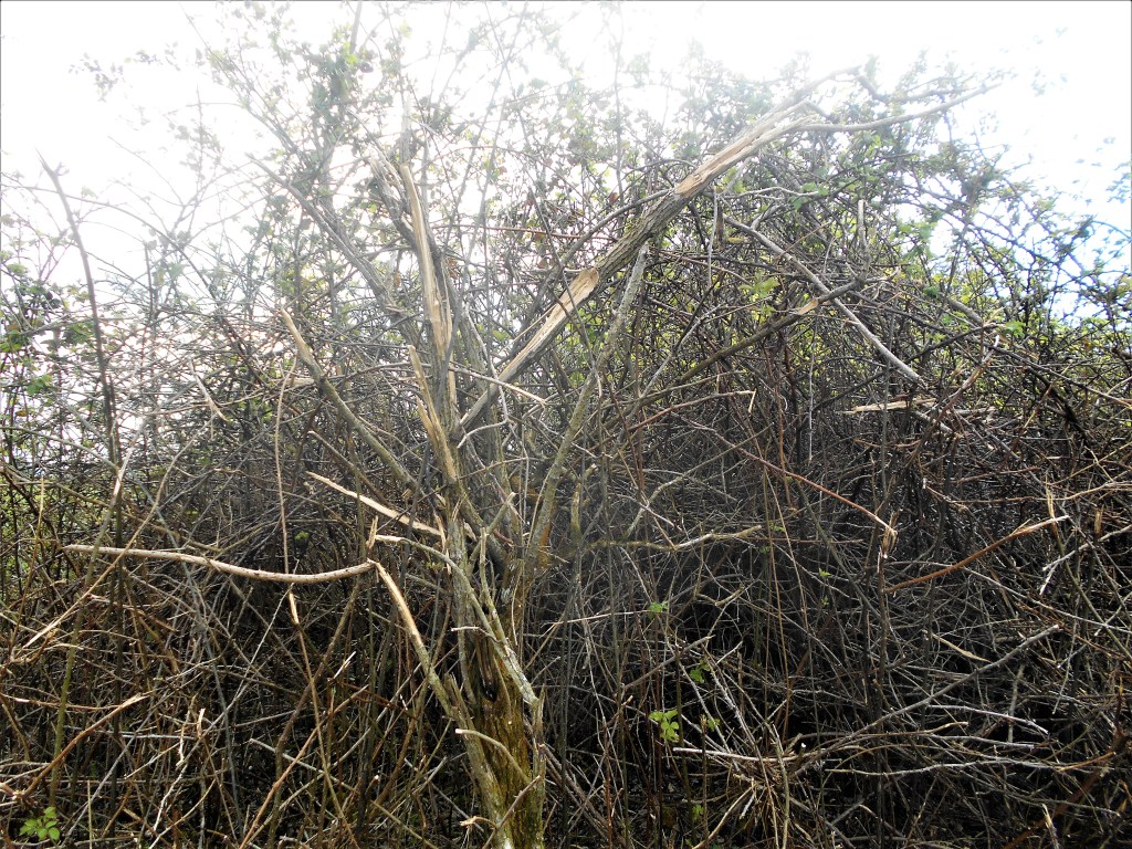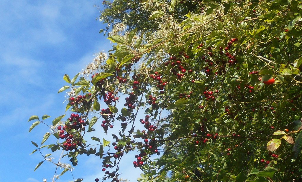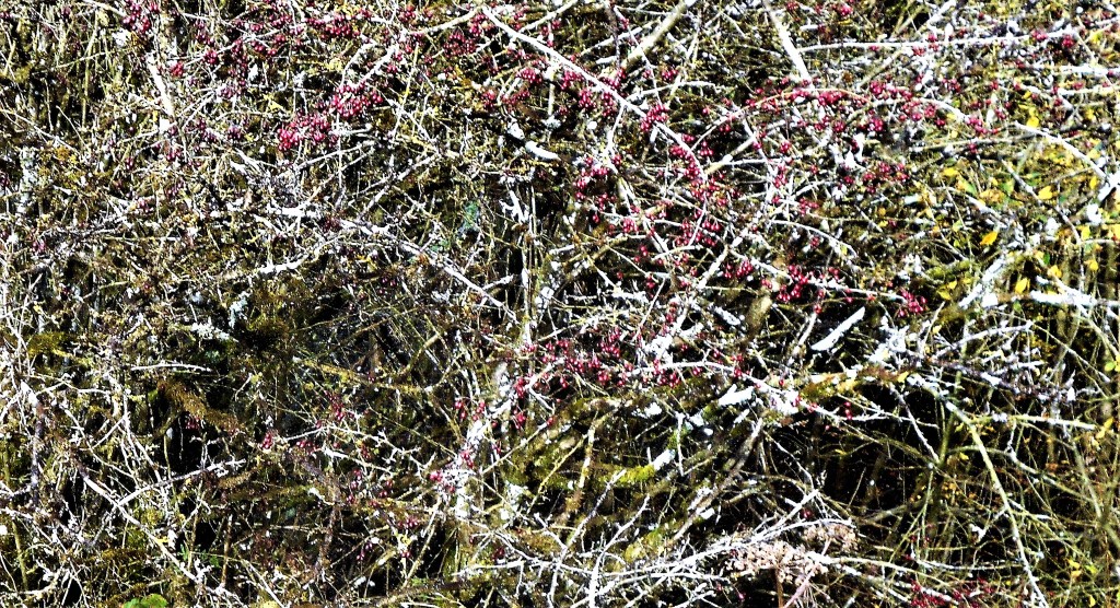 Rose briar in leaf, all the haws stripped from the hawthorns, some rose hips left, some apples rotting on the ground.