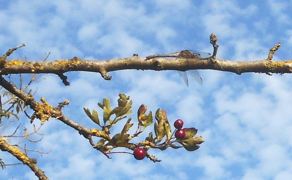 This is a very common dragonfly, breeding in all sorts of waterbodies from ponds and ditches, to rivers and lakes. These two dragonflies, coupled together in tandem whilst the female laid her eggs. The shallow puddle of water in the slight hollow formed by walkers using the path surely presented a danger of the puddle drying up but also a bigger danger of lack of food for the hatched larvae to feed on suggests this was a very unwise choice of habitat. Possibly the larger male which kept approaching and bothering the pair may have made them desperate.