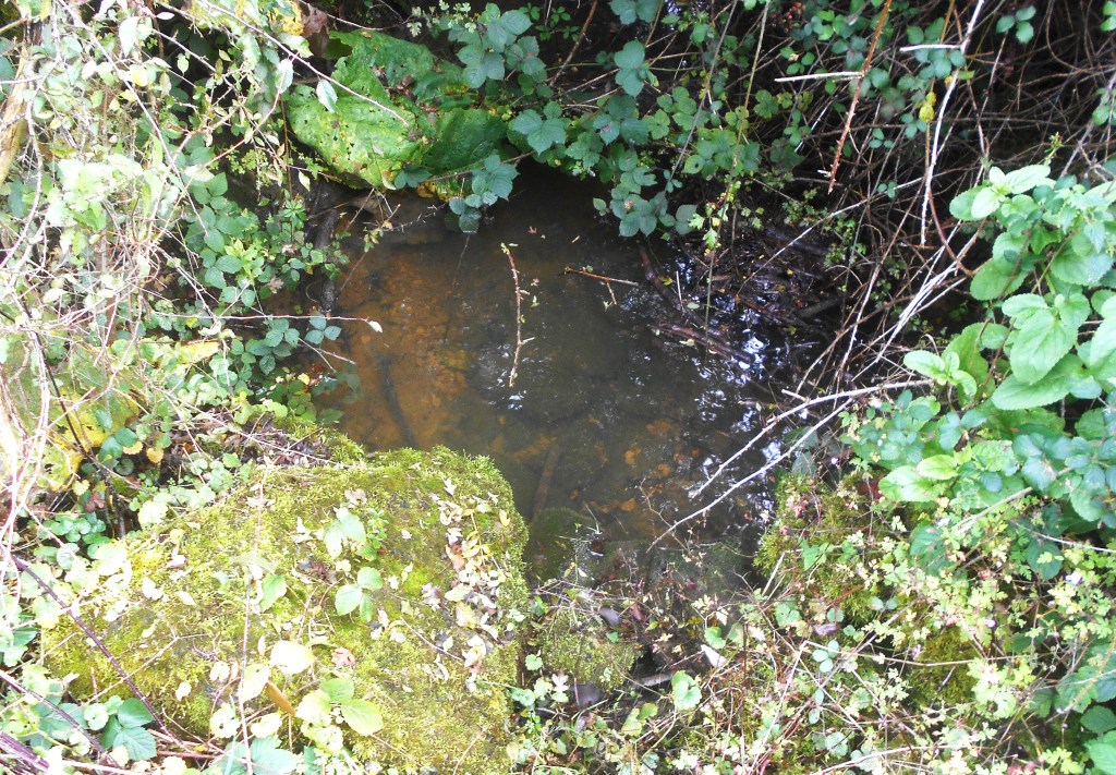 Winterbourne in full, noisy spate – lots of waterfalls over leaf/branch blocked dams.
