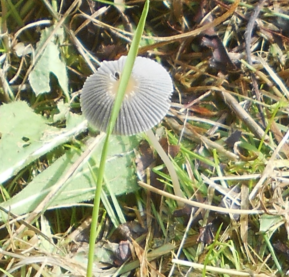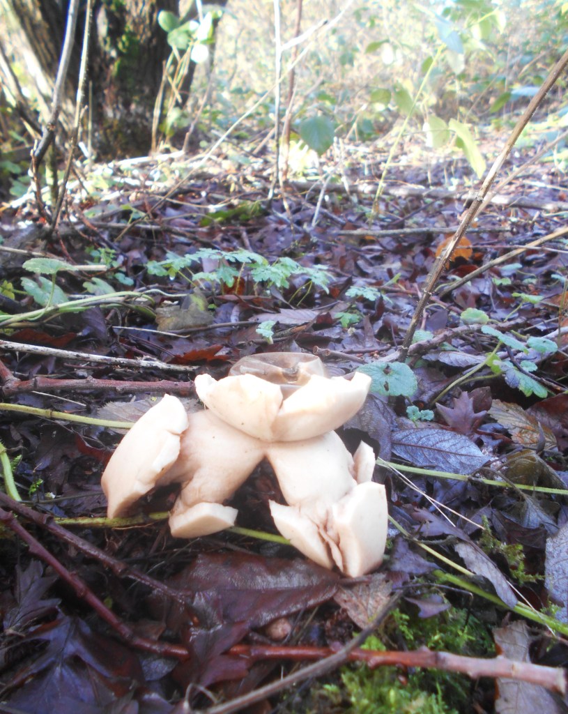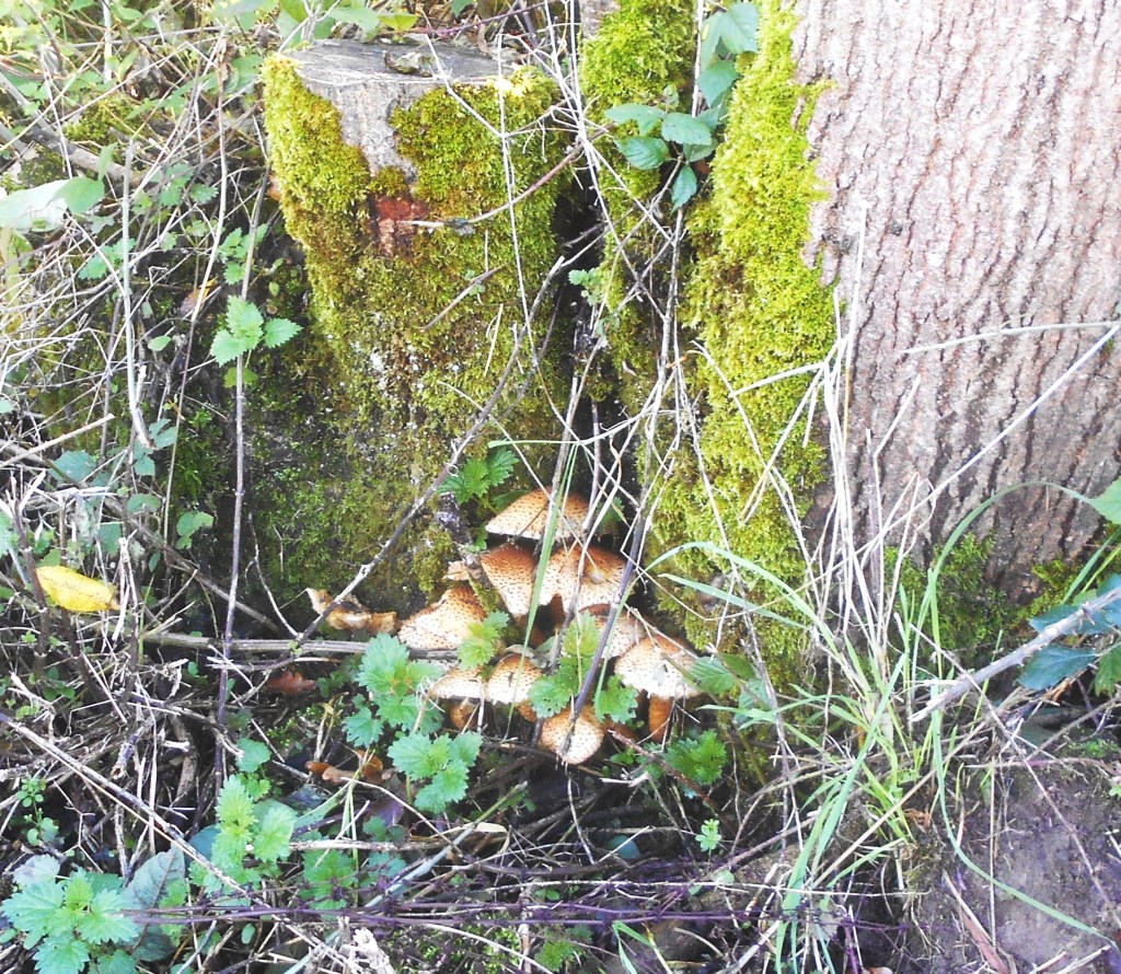 We are on the hunt for fungus along the borders and grass verges of the new cycle path. We don’t expect to find either the variety or richness of our usual haunt in autum in the thickly wooded areas of mature beech and oak trees but this delicate, rather beautiful fungus was a lucky find. Possibly a Hare’s Ear fungus, it certainly has the texture of a cup fungus but it was half hidden in the grass beside a large clump of Honey Fungus so we will need to check it again in a week or so by which time it should be fully developed.