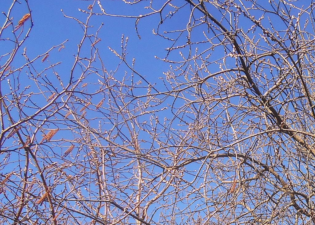 Leaf buds fattening on the hazel trees, elder leaves out, tiny green leaves on some shrubs.