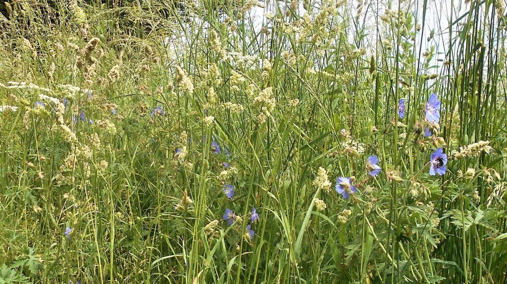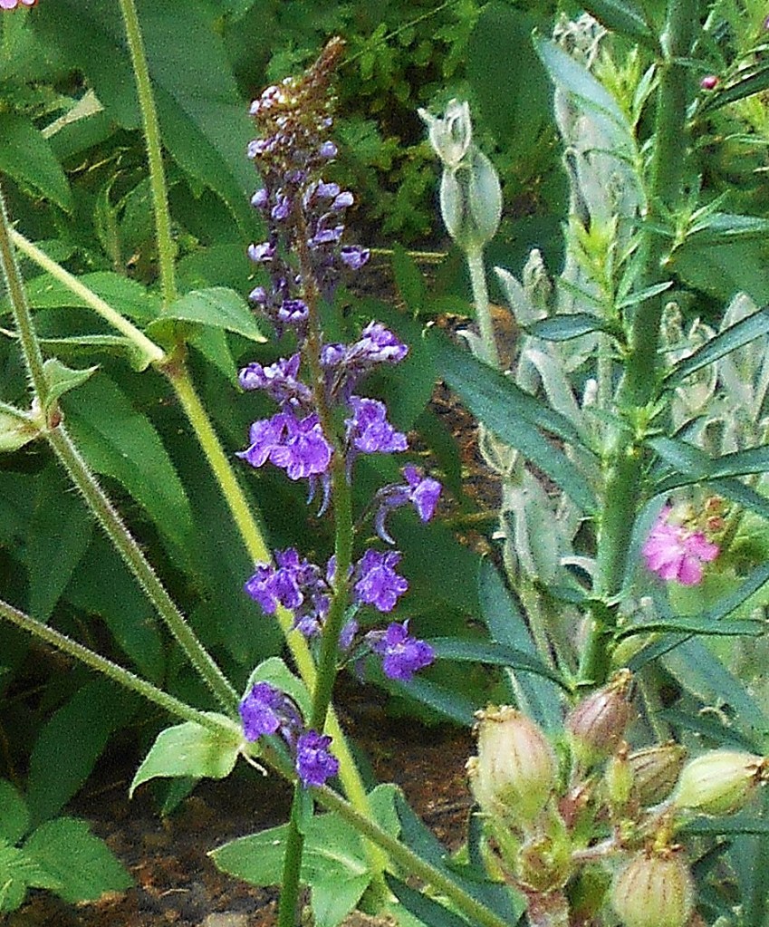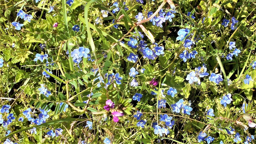A flowers in the bed make bright splash of colour and have probably been planted with favourite garden flowers by the volunteers whose hard physical work has made this cycle path possible. As well as the Woad plants which are native and long-established in the area, this Fernleaf Fiddleneck is non-native and introduced. Flowering from May to August attracting bees and other pollinators, it is known to self-seed and makes a welcome and lively addition to the path.