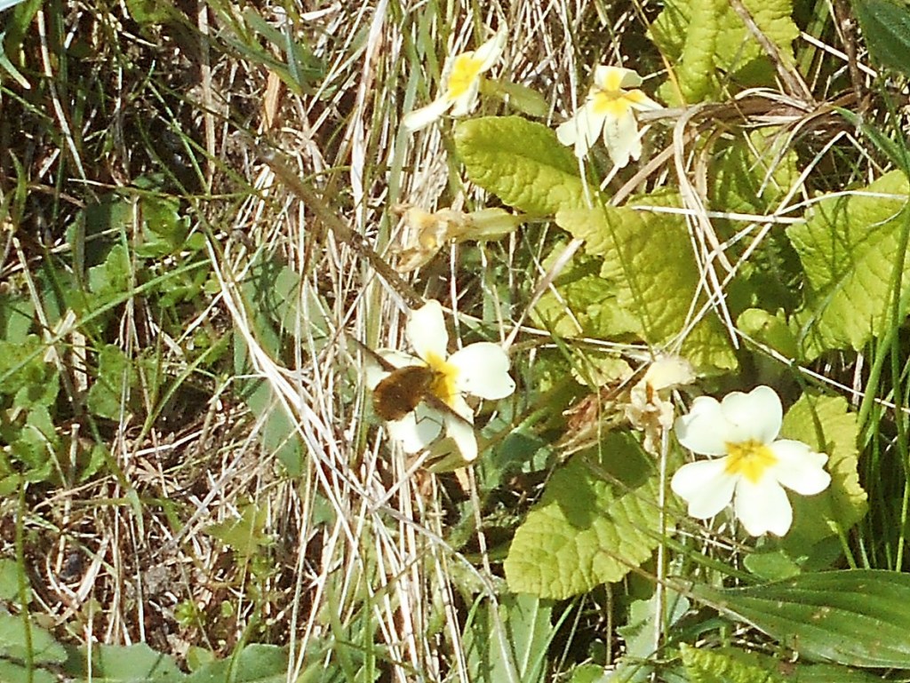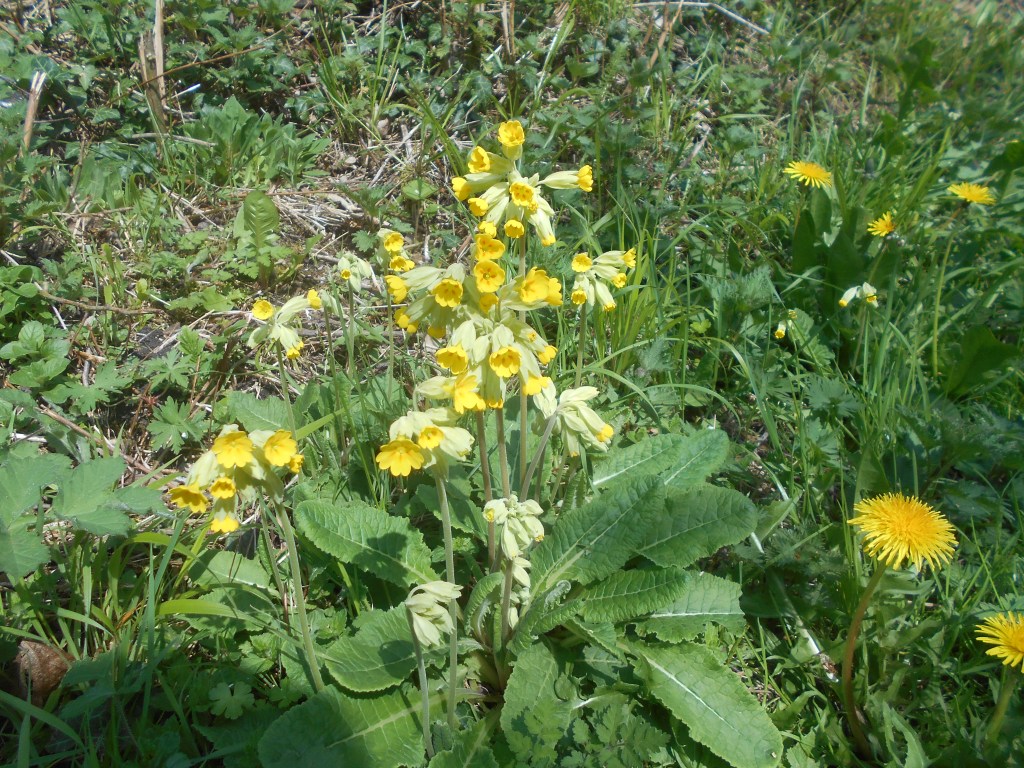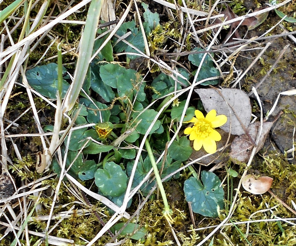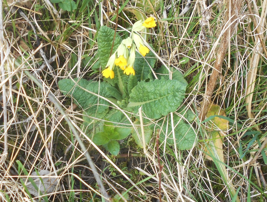 First primroses in flower, furry catkins of the pussy willow pushing through, arum lilies about 5 inches tall, snowdrops.