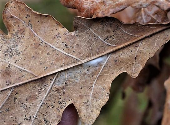 The common spangle gall wasp produces a small, disc-shaped growth, or ‘gall’, on the undersides of oak leaves in early autumn. Inside the gall, the larvae of the wasp feed on the host tissues, but cause little damage. It is common and widespread, and a single leaf can host up to 100 galls, each containing a single larva.