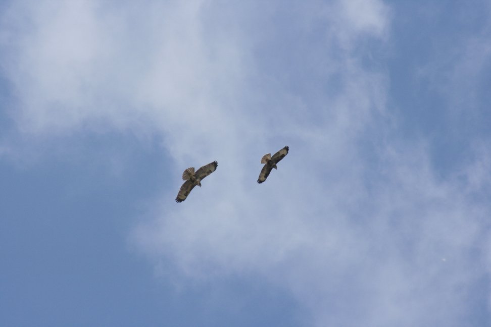 2 buzzards, blue tits, great tits, robins, blackbirds, rooks, jackdaws and crows. A greater spotted wood pecker drumming, green woodpecker yaffling, pheasants, wood pigeons, song thrush singing, long tailed tits, wren and two mallards on the edge of a flooded field!