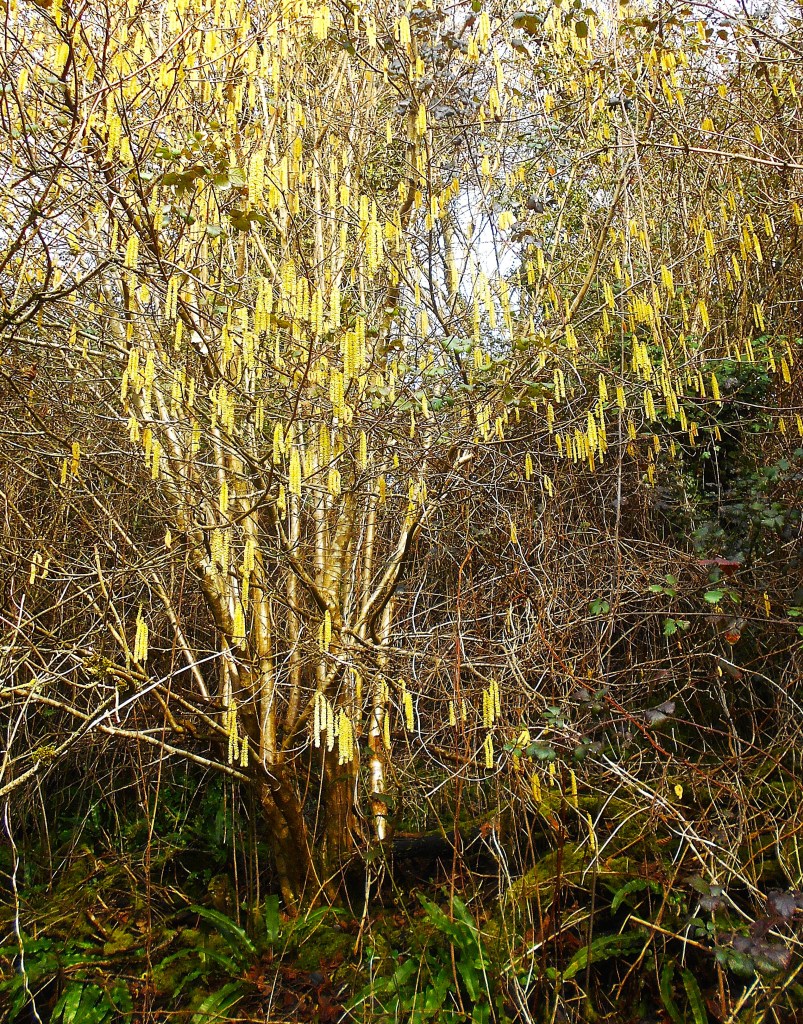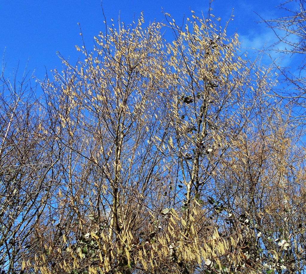As a good sign of a mild autumn and early winter, hazel catkins showing yellow and new leaves are unfurling on the honeysuckle (woodbine).
