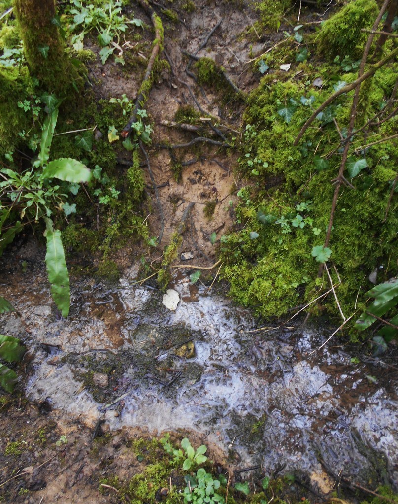 Walking along the path beside the stream we noticed a path created by animals crossing from one side of the cycle path to the other and deer (by the size almost certainly roe deer) prints in the wet clay showing the way they had taken to get through the hedge down to the stream to drink.