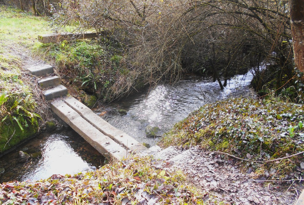 The stream or winterbourne run off from the fields above the flight of steps showing just a shallow trickle.