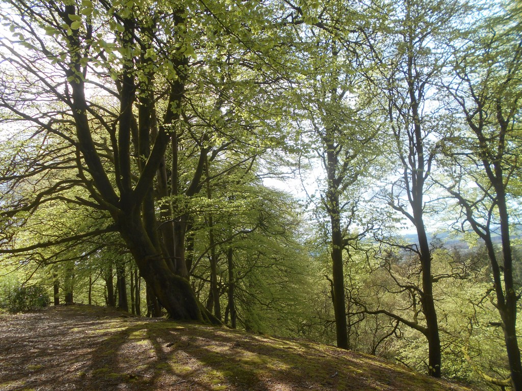Flocks of rooks and jackdaws circling above tall beeches which form a boundary at the top of the ridge; well spaced crows and magpie nests among the upper and middle bare branches of the trees.