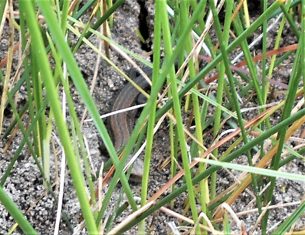 A carefully hidden Geocache waterproof box spotted, almost obscured by a thick clump of grass beside a track showing signs of people not just wildlife but although we examined the quirky contents of the box, we had nothng of interest to put in so we returned it to its hiding place without a swap.