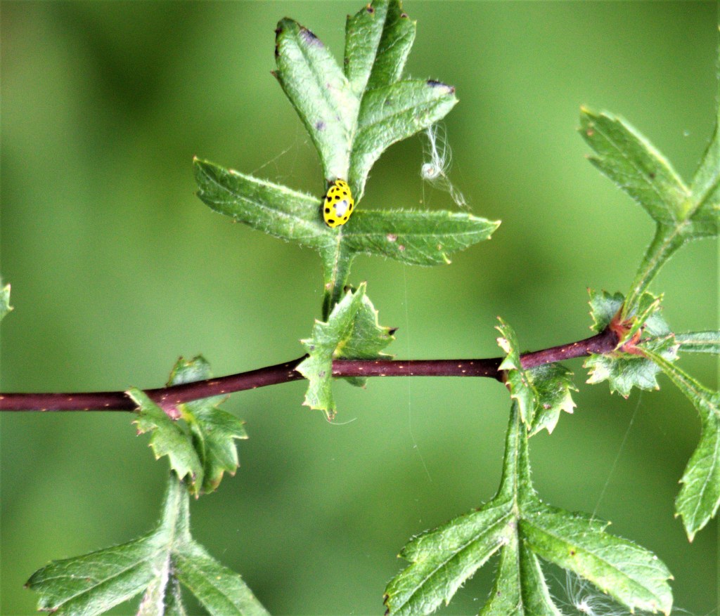 How refreshing to tramp “the short walk” up onto the top of the old railway embankment, past steep, high slopes thick with tall Hemp Agrimony and Rosebay Willow Herb, Burdock with its huge leaves, nettles and thistles entangled with Woody Nightshade, fruiting brambles, large ferns and half hidden fungus. The path with its view over the pasture (no sign of the usual horses) was lined with Enchanters Nightshade and the whole area alive with bees, hoverflies and butterflies, rises up to the trees towering along the top of the embankment – a mixture of Ash, Field Maple, Hawthorn, Hazel and Rowan saplings.