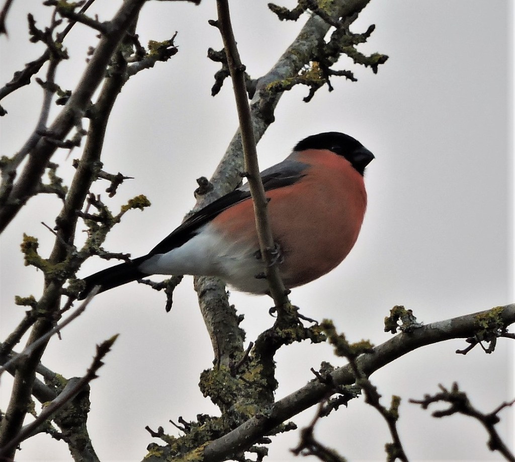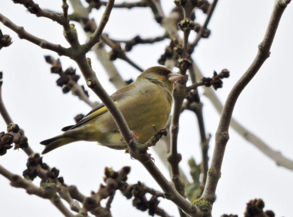 Noisy flock of 30-40 twittering gold finches mixed with a handful of field fares and redwings disturbed by two buzzards hunting low above the trees. 7 bullfinches – 3 males and 1 female in one group 2 males in the other. 2 long tailed tits. Party of 4-5 blue tits flying over. Wren feeding on the ground. Heard a song thrush in full song, a jay and a tawny owl (3.30pm). Flocks of jackdaws, rooks, wood pigeons, crows and seagulls, most flying westwards. Robins singing lustily, blackbirds, fewer pheasants.