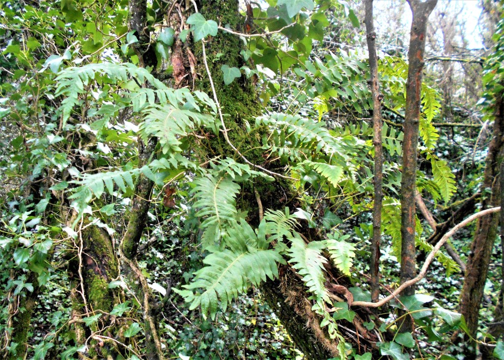 It is full of strange looking plants like Great Horsetail, Hart’s Tongue Fern, and trees wreathed in dark ivy, thick moss and lichen, with both their rotting stumps and their thick layers of dead leaves scattered with fungi.