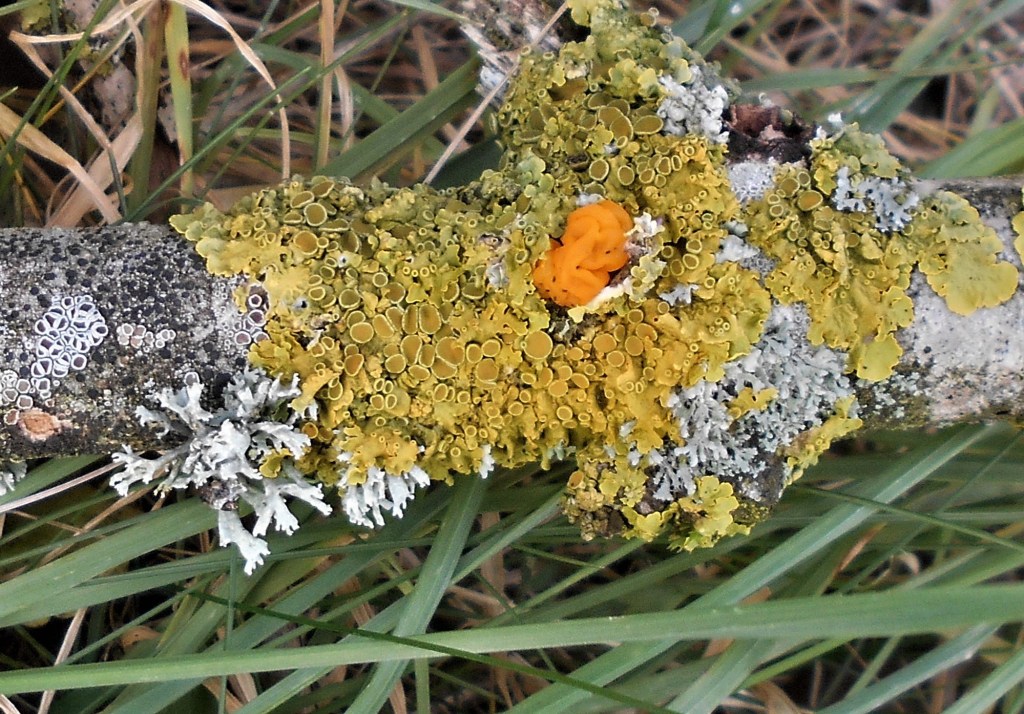 As we passed the line of wych elms bordering the fields we spotted the side of one of the tree split down to the trunk, the broken half lying across the verge and close by a sheath of one of its branches beside it. The cluster of bright, lime green lichen which clung to the bark glowed in the sunlight but when we picked it up, we noticed the small grub or possible bark beetle larva on the outside.